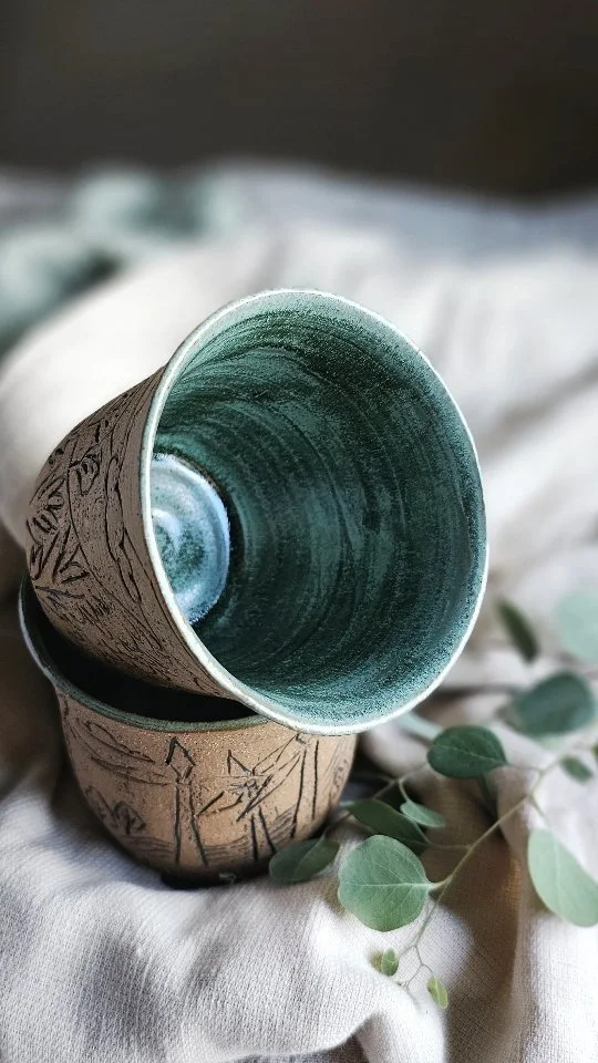 Each piece I make — wheel-thrown or handbuilt — is formed slowly by hand, honouring movement, texture and the beauty of imperfection. My glazes echo the landscape around me: mossy greens, rain-washed blues, earth after storm. No two pieces are ever the same. I value the evidence of the maker in the made.
